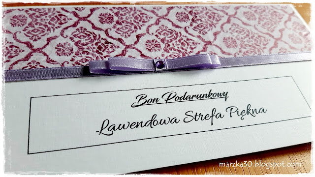 Mimo ciężkiej sytuacji na świecie związanej z pandemią Covid 19 mojej siostrze udało się otworzyć 30 października 2020r. swój salon kosmetyczny o wdzięcznej nazwie Lawendowa Strefa Piękna w Opolu. Siostra jest zakochana w lawendzie i fiolecie, dlatego też cały salon jest utrzymany w tym klimacie i pachnie lawendowo. Siostra poprosiła mnie o wykonanie dla niej lawendowych bonów podarunkowych przed świętami BN.